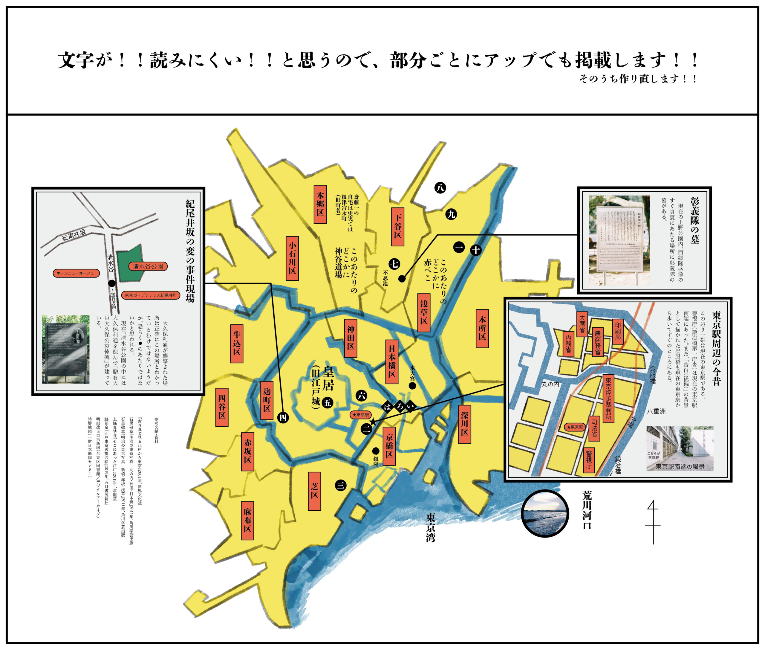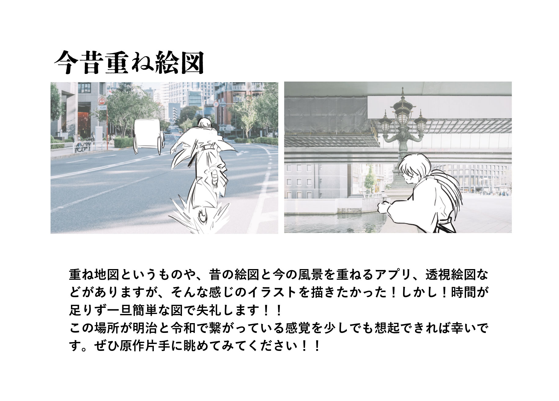「今昔浪漫地図」と題して、現代の東京と剣心たちの生きる明治の東京が地続きで繋がっている感じが少しでも想起できると嬉しいな〜と考えながら作った地図です。また後ほど見やすくまとめたい!!です!!