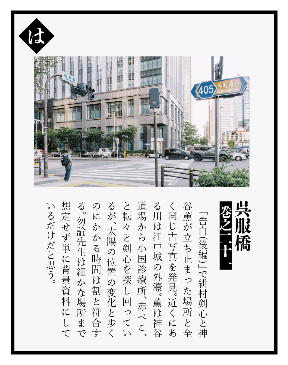 るろうに剣心第百八十三幕「告白(後編)」の背景資料の場所は『呉服橋」沿いの道。