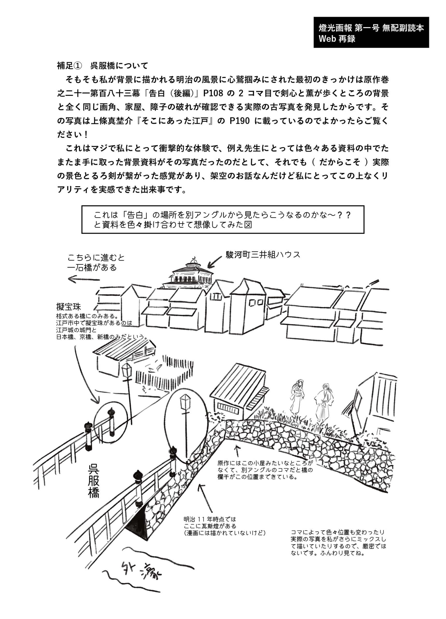 108頁で大きく描かれている橋が呉服橋、漫画には描かれていないが剣心と薫が歩いて行く先には一石橋がある。このあたり国立公文書館デジタルアーカイブなどで調べた。